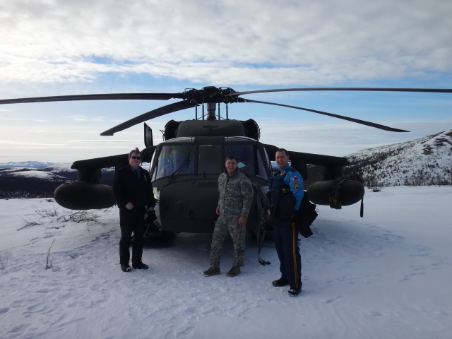 Sgt. Hatch and Sgt. Lavin in front of a Black Hawk for a Search and Rescue near Sleetmute